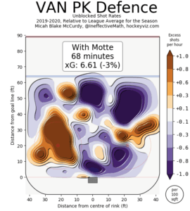 In the 23 games that Motte missed, the pk was running at 79.7%, which was tied for 21st in the league. Throughout the season, the high danger chances occur from the slot as opposed to when he in the PK. A team setting up shop in the slot tends to lead to a PK that is below 80%. When Motte is in the lineup, the shots usually come from the left side, which would be less of a danger spot compared to right in the slot as per the graph below.