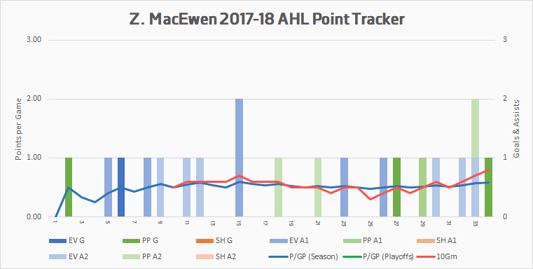 By but and large, many of the red flags that caught my attention when he was signed out of the Q haven’t been present in the American League. His late development curve is no longer as relevant as his current performance. Grouped with players his age in junior, MacEwen wasn’t even playing in the QMJHL (let alone standing out) when he was rookie eligible. Pitted against AHL rookies now though, he stacks up well, sitting 24th in points and 33rd in points per game (minimum 10 GP).