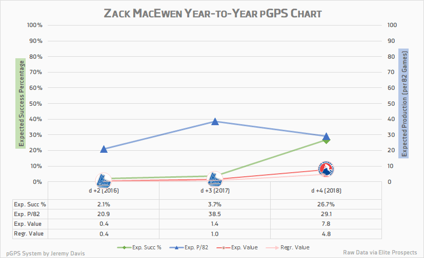 This is a sizable jump up from the projections in his junior career. As mentioned, one of the red flags I originally noted was that he didn’t play regularly in the Q until his draft-plus-two season. In the two junior campaigns, his Expected Likelihoods of Success were rated at 2 and 4%, making this season a very noticeable jump. (It’s the green and red lines you want to pay attention to here – they have the highest degree of predictability).