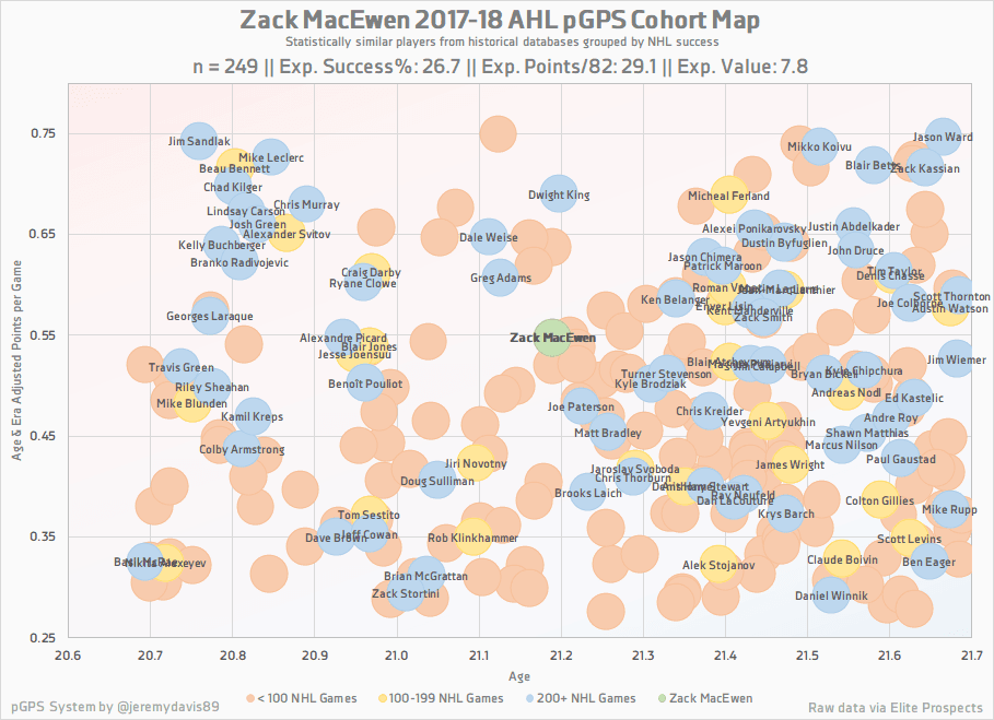 From a prediction standpoint, MacEwen is beginning to look quite promising. He has an Expected Likelihood of Success of 27%, which is, impressively, the fifth highest among Canucks prospects right now (not including Elias Pettersson and Jonathan Dahlen, who are both without comparables by virtue of overmax-ing their cohort production range). His statistical matches include former Canucks like Zack Kassian, Jim Sandlak, and Greg Adams (the good one), as well as current Canucks coach Travis Green. The majority of his matches fall in the bottom six/replacement level range, and pGPS has assigned his cohort a weighted average line assignment of “4th Line Forward”.