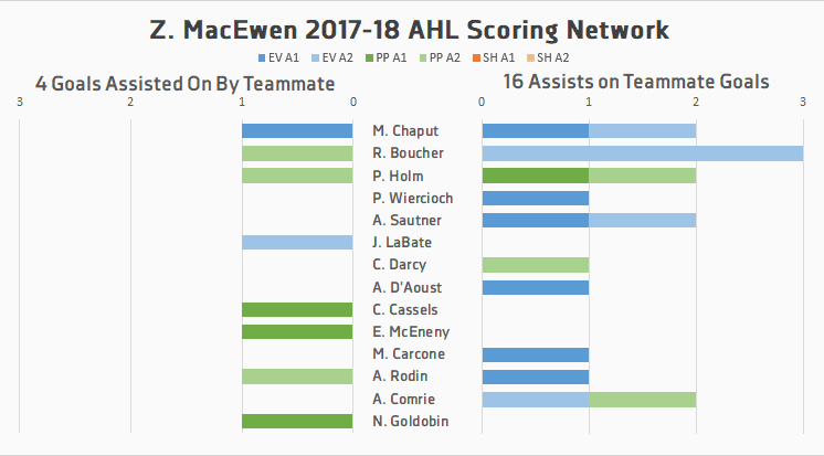 Circling back to another criticism from last season – that he benefited heavily from playing with superior linemates in Gatineau – it would be difficult to insinuate that MacEwen has benefited from playing with any teammates in particular in Utica, especially of late, when the Comets forward ranks have been shredded by an assortment of injuries. He did have the opportunity to play with the likes of Boucher, Goldobin, and Chaput, when they were all together in Utica, but it’s not like all his production came at those times – he’s been pretty consistent with an array of linemates. In fact, check his four goals and you’ll see that eight different players have assisted on them. The same can be said of his assists: they are highly diverse.
