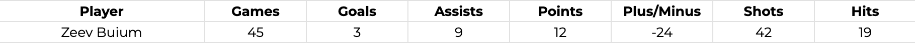 Head Coach Adam Foote decided that it was best for Buium’s development to sit him down for a game on January 12 against the Montreal Canadiens. Buium found his way back into the lineup the following game, where he was heavily relied upon, logging 21:13 minutes of ice time. And in the next game, Buium found his way back onto the scoresheet, picking up an assist on the lone Canucks goal against the Columbus Blue Jackets.